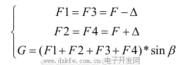 四轴飞行器系统通过同时加大 2 号和 4 号电机的转速、减小 1 号和 3 号电机的转速,产生 y 轴两侧的升力差,在理想情况下, 2、 4 号电机减小的百分比与 1、3 号电机增大的百分比相等,以此来保证飞行器系统垂直方向的合力为 0,同时产生沿 y 轴方向的水平分力,产生俯仰角度β。