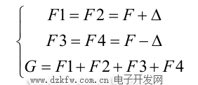 四轴飞行器系统通过同时加大 1 号和 2 号电机的转速、减小 3 号和 4 号电机的转速,产生反扭矩力差,在理想情况下,1、2 号电机减小的百分比与 3、4 号电机增大的百分比相等,以此来保证飞行器系统垂直方向的合力为 0,同时产生绕 z 轴旋转的力。