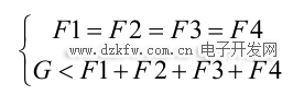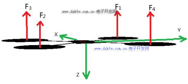 四轴飞行器系统通过同时加大 1 号和 4 号电机的转速、减小 2 号和 3 号电机的转速,产生 x 轴两侧的升力差,在理想情况下, 2、 3 号电机减小的百分比与 1、4 号电机增大的百分比相等,以此来保证飞行器系统垂直方向的合力为 0,同时产生沿 x 轴方向的水平分力,产生横滚角度α。