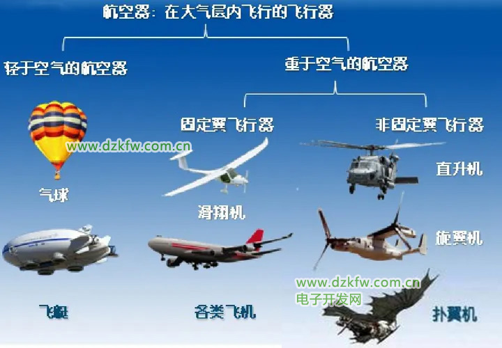 大气层内飞行器可以分两类,一类是通过空气浮力产生的飞行器,这类飞行器的密度比空气轻,如气球、飞艇;另外一大类是通过机翼产生的飞行器,这类飞行器的密度比空气重。在第二大类中又分固定翼飞行器(如滑翔机、动力飞机)和非固定翼飞行器。
