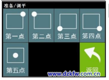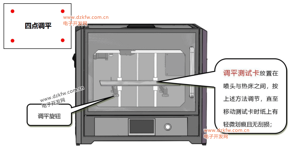 第三步:【返回】主界面,点击【调平】选项进入调平界面,依次完成四点调平; 喷头移动到对应的点后,将调平测试卡放置在喷头与平台中间,移动调平测试卡检测平面与喷嘴间距:若调平测试 卡过松,则“顺时针”微调旋钮,减少平台与喷嘴间距;若调平测试卡过紧,则“逆时针”微调旋钮,增加平台与 喷嘴间距,直至移动调平测试卡时纸上有【轻微划痕且无刮损】,即表示该点已调平。