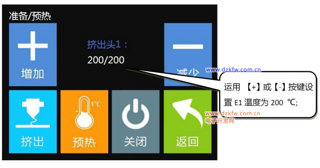 第一步:选择【预热】按键,进入预热菜单;选择预热“喷头 1(E1)”,运用 【+】或【-】按键设置 E1 温度 (参考温度值:PLA≈200 ℃,ABS≈240 ℃);注:本说明演示的耗材是:PLA