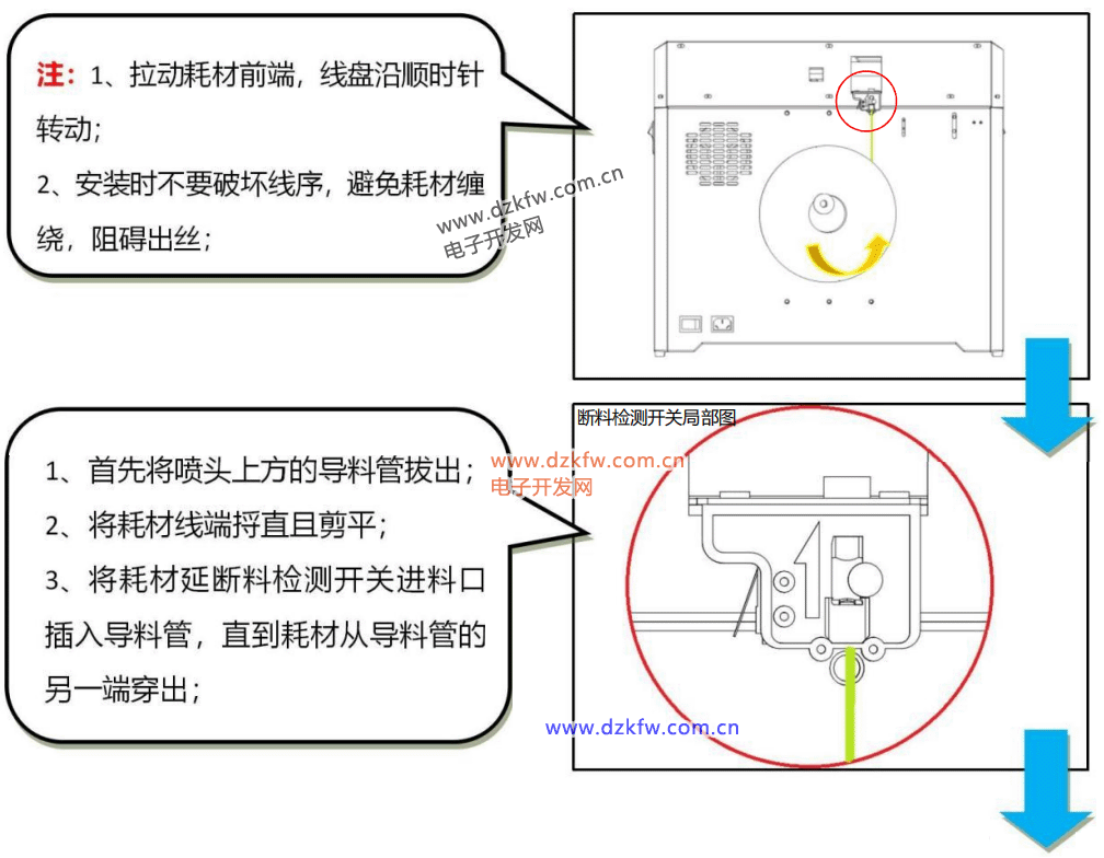 第二步:预热过程中,将耗材装上料架,将耗材延进料口插入导料管,直到耗材从导料管的另一端穿出,按住喷头 左侧的按钮,将耗材线头沿进料孔插入至进料器夹紧; 第三步:预热完成后,然后选择【进料】按键,直到喷嘴均匀出丝后,即装料完成。