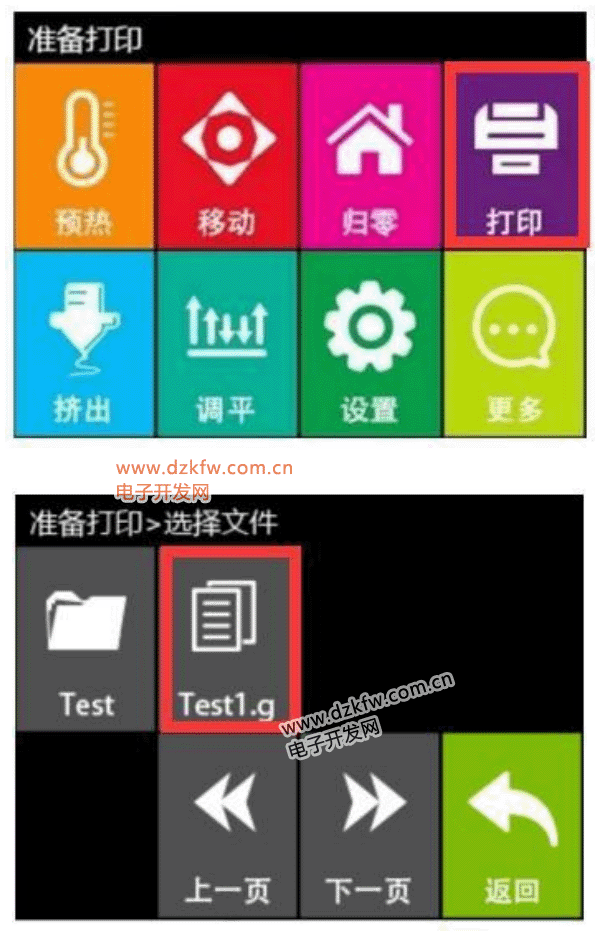 第二步:插入 SD 卡,然后点击“准备打印”界面中的【打印】按钮,进入“选择文件”界面选择待打印模型文件;
