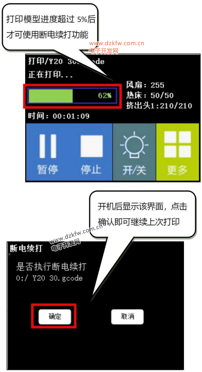 :打印模型的进度只有超过 5%后才可以使用断电续打功能。