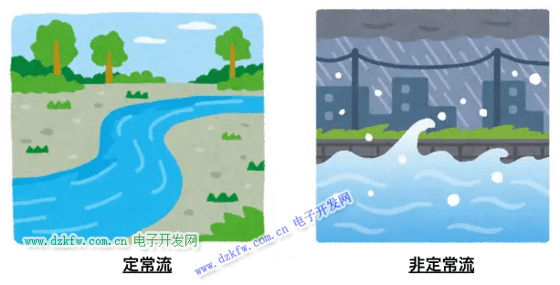 - 不稳定流:随时间改变状态(速度、流速、流向)的流
