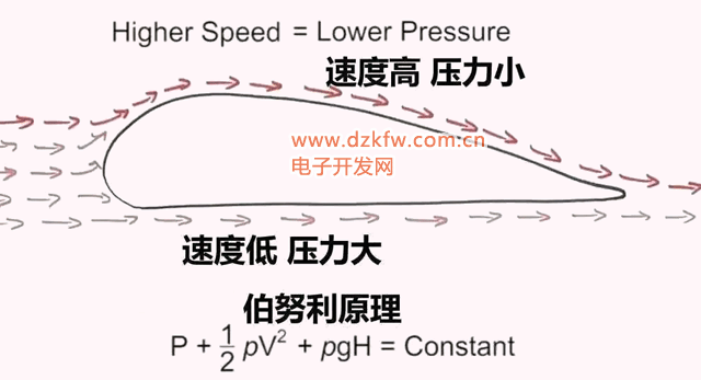 飞机为什么能够飞上天?因为机翼受到向上的升力。飞机飞行时机翼周围空气的流线分布是指机翼横截面的形状上下不对称,机翼上方的流线密,流速大,下方的流线疏,流速小。由伯努利方程可知,机翼上方的压强小,下方的压强大。这样就产生了作用在机翼上的方向的升力。