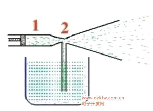 喷雾器是利用流速大、压强小的原理制成的。让空气从小孔迅速流出,小孔附近的压强小,容器里液面上的空气压强大,液体就沿小孔下边的细管升上来。从细管的上口流出后,空气流的冲击,被喷成雾状。