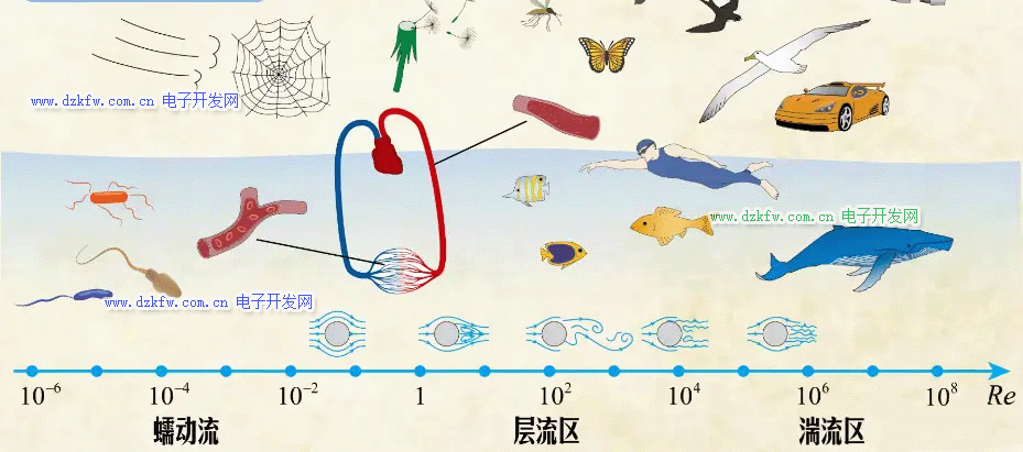 下面我们在描述运动的NS次方程中看看雷诺数的影响。这是简化的x方向动量方程: 现在因为一些流场的特征量来对其进行无量纲化: 假设直到 为流场特征量,带星的变量就是无量纲的了。将这些关系式代入到上面的方程中,整理后就得到了无量纲的方程: 无量纲方程可以用来描述任何几何相似,边界条件相同的流动。可以看到,相比有量纲方程,无量纲方程中多了两项,这两项分别对应两个无量纲数,一个是欧拉数 ,一个是雷诺数的倒数 。欧拉数表示了压力与惯性力之比,当使用压差力分析问题时并不起作用,所以影响整个方程的就只剩下雷诺数了。雷诺数影响无量纲方程预示着几何相似的流动,如果雷诺数不同,流动就不同。雷诺数出现在粘性项的分母中,它越大,粘性项的影响就越小。当雷诺数远远大于1时,粘性力趋向于零。这时,运动只由压差力决定: 可以想象这对应于流动符合伯努利方程的情况。当雷诺数远远小于1时,粘性力非常大,任何压差产生的驱动力都会被几乎同等大小的粘性力抵消,所以流体很难产生加速度。可以说毫无惯性可言,惯性力是可以忽略。这时粘性力与压差力平衡: 这种流动非常符合亚里士多德的描述,就是力是维持物体运动的原因,一旦驱动力消失,巨大的粘性力就会立刻让运动停下来,一步也不多走。这里给出了一些常见运动的雷诺数: