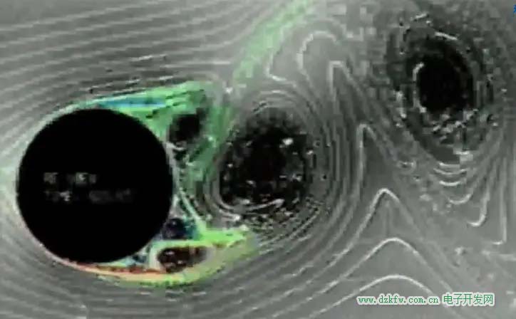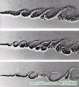 再增加雷诺数,阻力还会有突然减小然后又突然增大的现象。规律这么复杂的原因是阻力并不仅仅由粘性力构成。在蠕动流状态下,流体绕球流动,看起来前后是对称的,其实并不完全是。前后的流速是对称的,但压力并不对称。这时流动阻力主要是由流体与球表面之间的摩擦力造成的。在中等雷诺数下流动为层流,但非定常性可能很强。这时,流体绕过球后形成规则的脱落涡,即卡门涡街: