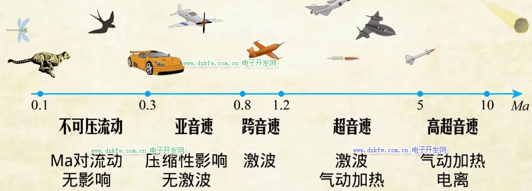 基本上所有生物的活动都属于不可压流动,这时马赫数不影响流动。亚音速流动中马赫数对流动的影响主要是压缩性方面;跨音速流动的主要特点是出现了激波;超音速流动受激波影响,并且出现了压缩和摩擦引起的气动加热问题;高超音速流动则由于气动加热温度过高,还产生了气体电离等问题。这是几种形状的物体的阻力系数,随马赫数的变化:
