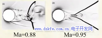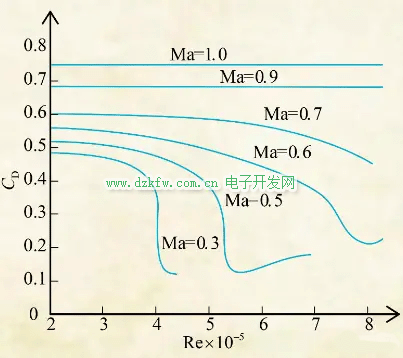 随雷诺数和马赫数的变化可以看出,低马赫数下阻力系数随雷诺数变化很大;而当马赫数接近1时,阻力系数基本不再随雷诺数变化了。这是因为这时激波是流动的主要决定因素。