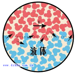 从微观上,粘性是由于分子之间的作用产生的。下图,红色分子表示上层速度快的流体,蓝色分子表示下层速度慢的流体,两层之间互相牵扯和挤压,就产生了粘性剪切力。这种牵扯和挤压伴随着化学键的形成破坏。这与固体之间的摩擦力是类似的。不同的是流体分子的上下层存在掺混作用。