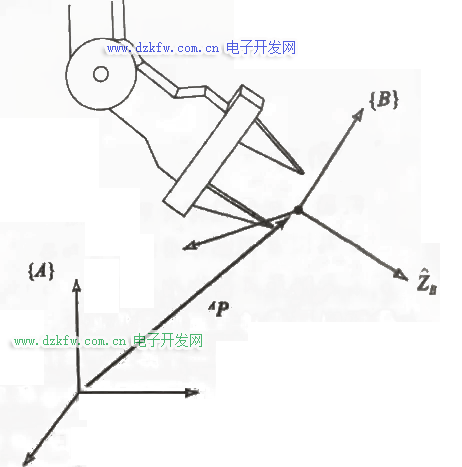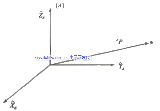 当我们对机械臂建立坐标系时,往往将底座作为基准坐标系,图中坐标系A便是基准坐标系,就能用一个3\times1的位置矢量给出坐标系中的任何点定位。还要注意矢量定义在哪一个坐标系。^AP是指相对坐标系A的一个点的位置。