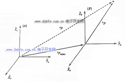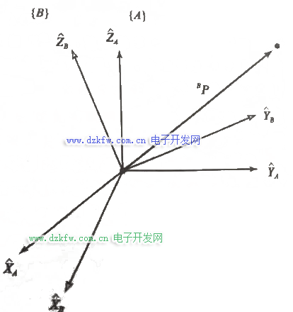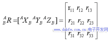 用XB,YB,ZB来表示坐标系{B}各主轴方向的单位矢量,当用坐标系{A}来表示时,它们被写成AXB,AYB,AZB,将三个单位矢量按AXB,AYB,AZB顺序排列组成一个3×3的矩阵,称之为旋转矩阵,用符号ABR来表示。