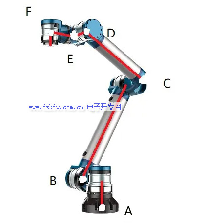 有了位姿的描述,我们就能知道一个连杆末端也就是关节相对于上一关节的位姿,依次描述最后就能获得末端位姿。如图所示,红色表示连杆,白色表示关节处,每个关节处就代表一个坐标系,通过坐标系的递推计算,就能算出末端坐标系相对基准坐标系的位姿。