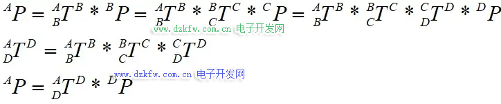 于是我们就可以通过转换算子来描述两个坐标系的关系,同样转换算子是可以叠加的,通过不断的叠加就可以算出末端与基准坐标系的转换算子,也就是得到末端相对于基准坐标系的位姿。