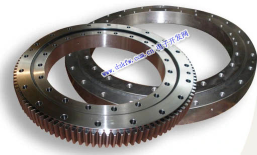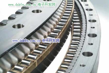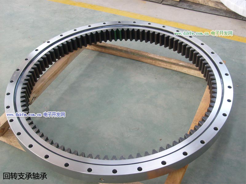 回转支承,是一种能够承受综合载荷的大型轴承,可以同时承受较大的轴向、径向负荷和倾覆力矩。回转支承轴承一般带有安装孔、内齿轮或外齿轮、润滑油孔和密封装置,因而能使主机设计结构紧凑,引导简便,维护容易。回转支承轴承有无齿式,外齿式和内齿式的四点接触球轴承、双排角接触式球轴承交叉圆柱滚子轴承、交叉圆锥滚子轴承和三排圆柱滚子复合轴承四个系列,其中四点接触球轴承具有较高的静负荷能力,交叉圆柱滚子具有较高的动负荷能力,交叉圆锥滚子轴承的预过盈能使轴承具有较大的支撑刚性和回转精度,三排圆柱滚子组合轴承由于承载能力的提高引向轴承高度,各种力量分别由不同滚道承受,所以同样受力情况下,其轴承直径可大大缩小,因而有使主机更加紧凑的特点是一种高承载能力的回转支承轴承。回转支承轴承广泛用于起重机械、采掘机械、建筑机械、港口机械、船舶机具以及高精度的雷达机械和导弹发射架等设备的大型回转装置上。同时也可以根据用户的具体要求设计、开发、生产各种特殊结构回转支承轴承。