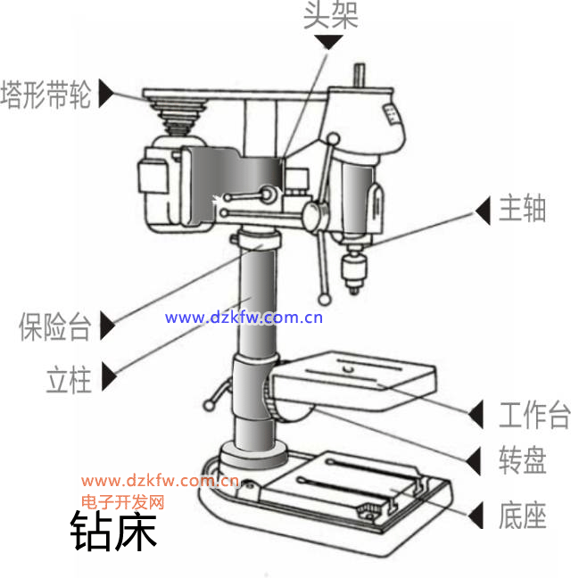 钻床主要用钻头在工件上加工孔的机大型钻床车间床。机械制造和各种修配工厂必不可少的设备。根据用途和结构主要分为以下几类:立式台式、摇臂式、深孔钻床、中心孔、铣钻床、 卧式钻床。