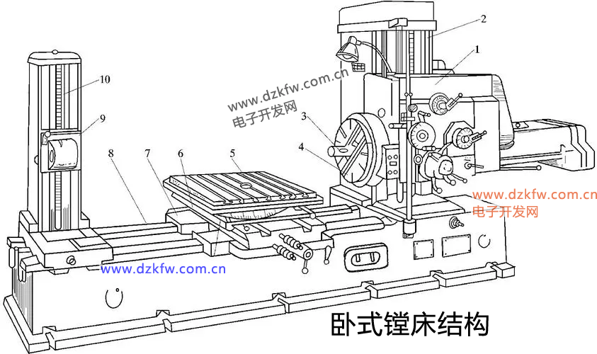 镗床主要是用镗刀在工件上镗孔的机床,通常,镗刀旋转为主运动,镗刀或工件的移动为进给运动。它的加工精度和表面质量要高于钻床。镗床是大型箱体零件加工的主要设备。