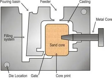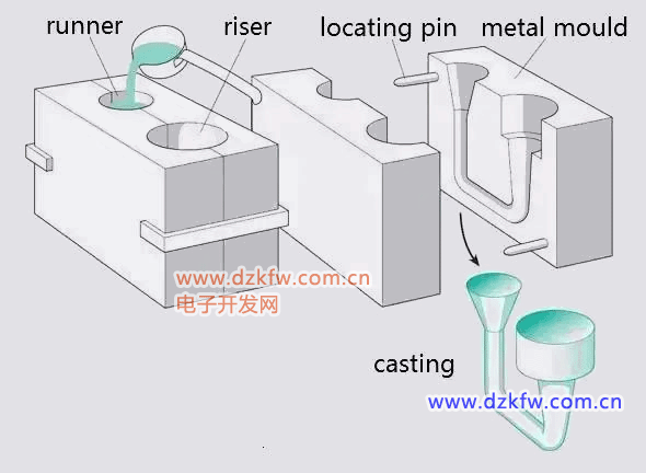 金属型铸造:指液态金属在重力作用下充填金属铸型并在型中冷却凝固而获得铸件的一种成型方法。