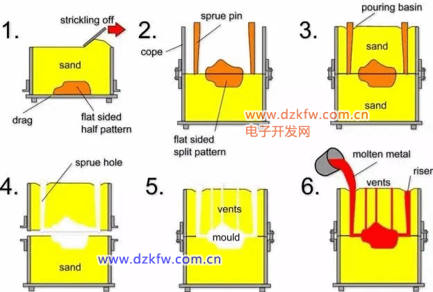 砂型铸造:在砂型中生产铸件的铸造方法。钢、铁和大多数有色合金铸件都可用砂型铸造方法获得。