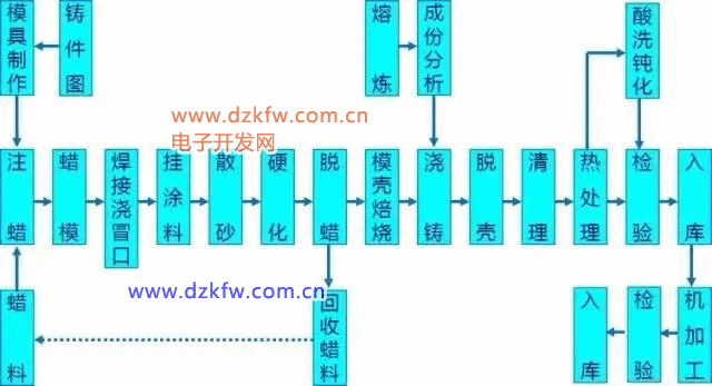 熔模铸造:通常是指在易熔材料制成模样,在模样表面包覆若干层耐火材料制成型壳,再将模样熔化排出型壳,从而获得无分型面的铸型,经高温焙烧后即可填砂浇注的铸造方案。常称为“失蜡铸造”。