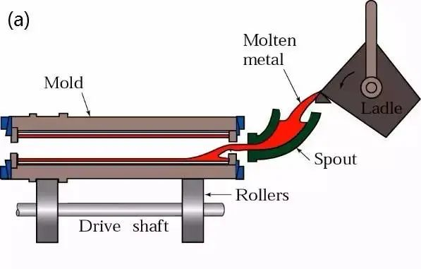 连续铸造:是一种先进的铸造方法,其原理是将熔融的金属,不断浇入一种叫做结晶器的特殊金属型中,凝固(结壳)了的铸件,连续不断地从结晶器的另一端拉出,它可获得任意长或特定的长度的铸件。