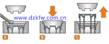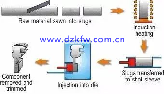 直接挤压铸造:喷涂料、浇合金、合模、加压、保压、泄压,分模、毛坯脱模、复位;