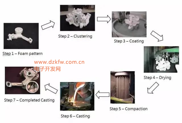 工艺流程:预发泡→发泡成型→浸涂料→烘干→造型→浇注→落砂→清理