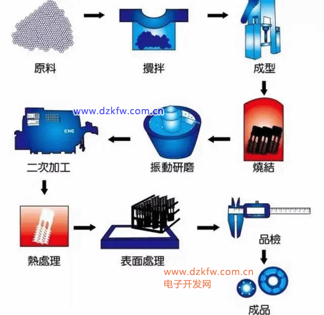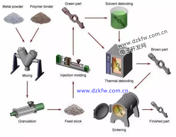 MIM流程分为四个独特加工步骤(混合、成型、脱脂和烧结)来实现零部件的生产,针对产品特性决定是否需要进行表面处理。