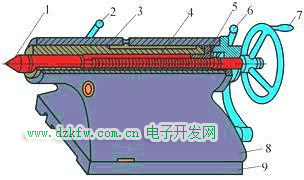 1顶尖 2套筒锁紧手柄 3顶尖套筒 4丝杆 5螺母 6尾座锁紧手柄 7手轮 8尾座体 9底座