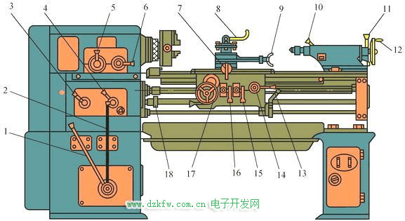 15—刀架横向自动手柄 16—刀架纵向自动手柄 17—刀架纵向手动手轮 18—光杠、丝杠更