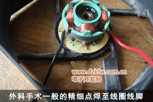 注意观察风扇的铜丝线圈,应该能找到两个或者三个线脚,中一个线脚连着两根铜丝,而另外两个只连着一根铜丝。你需要给那两个只连一根铜丝的线脚各焊一根导线上去。焊上后,就能用镊子拆下风扇电路板的其他电子元件(二极管啊、电容之类的)
