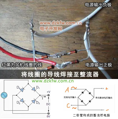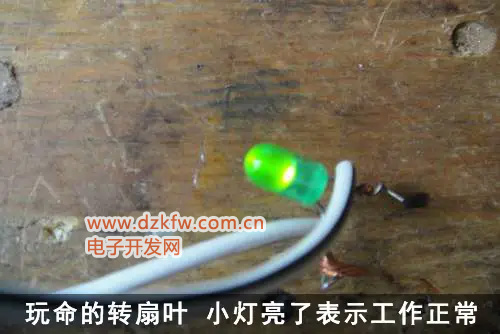 往整流器上焊线,从风扇出来的线接在中间,两头的白线(输出线)要长一些,强度要大一些,可以用一米左右长的门铃线。在输出线上接一个小灯,测试下。拼命的转扇叶,小灯只要发一点光,就表明能正常使用。