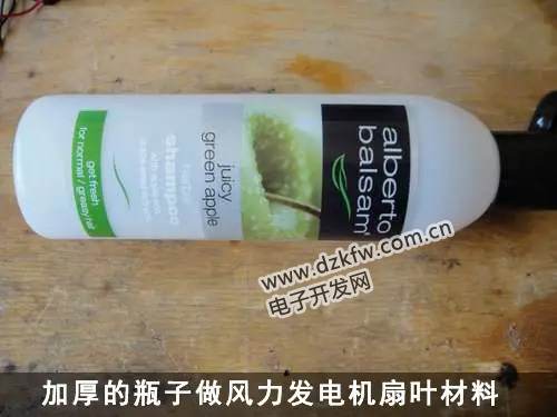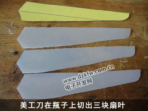 制作扇叶的材料,最好用用一定厚度的塑料瓶。其实洗衣液的瓶子不错。切割前的草图一定要设计好,对每个扇叶的制作水准要求不太高,除了保证顶角120度外,其他的差不多就OK。