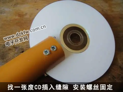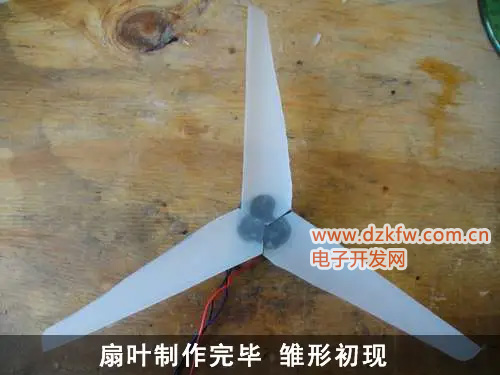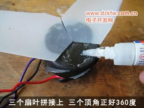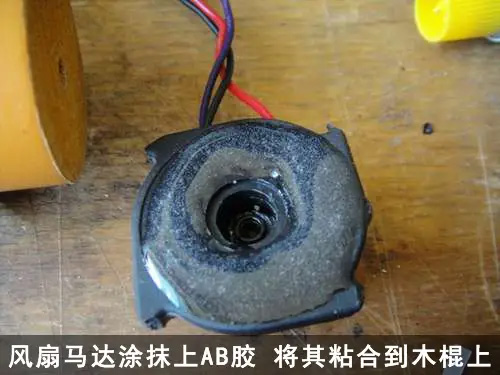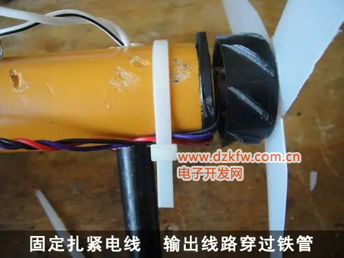 AB胶涂抹在马达上,将马达和木头棍粘在一起,要粘在靠近铁管的那头。扎紧电线和整流线路,并把输出线穿过铁管。风力发电机已然OK。