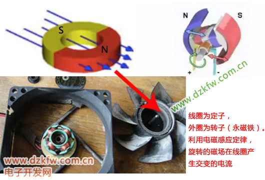 看DIY强人用电脑旧风扇DIY风力发电机。利用电磁感应定律:旋转的磁场,会在固定的线圈产生交变电场电流。