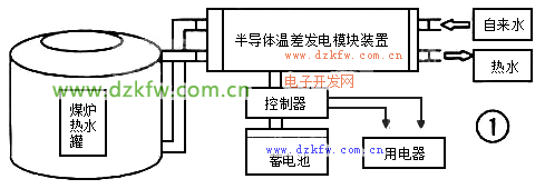 以蜂窝煤热水炉的进出水为温差源,制作了一台半导体温差发电装置,原理框图见图1。