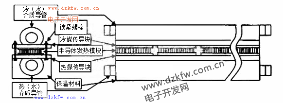 一是炊事温差,烧天然气、石油液化气、煤炭、沼气等等产生高温;二是空调、暖气温差;三是地温温差,庭院井水、溪水与地表的温差;四是太阳能温差,用太阳能热水器、太阳灶获得热量;五是冬季冰雪与室内、地下的温差,等等。但是,利用起来必须满足方便获得、经济、持续和有足够的能量的要求。实验表明,对目前通常的半导体温差发电模块每提供摄氏1度的温差可相应产生约0.03V电压,可见温差小就没有实际利用价值。本人之所以选择蜂窝煤热水炉的进出水为温差源,是因为炉火昼夜不熄,炉灶热水与进水(自来水)的温差大,夏季摄氏60多度,冬季可达摄氏90多度,且比较稳定。同时利用自来水的压力解决了能量无耗输送的难题,只要家庭成员洗菜、洗碗、洗手、洗脸、洗澡等一用热水,就能获得理想的温差。特别需要强调的是,半导体温差电偶模块是良好的导热体,如果两面没有高低温两种能量的输送,温差就不能维持,保温做得再好,模块两面的温度接近也是枉然。这是许多失败案例的根本原因。本发电装置用的是“过路水”,能耗视同为零,同时对热水的降温也不十分明显。图2是该装置的结构示意图。
