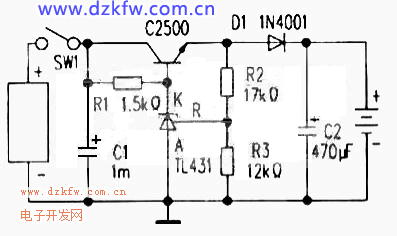由三端可编程集成电路TLA31和三极管C2500组成稳压充电控制电路。该电路适应输入电压的大范围变动,输出电压可调且稳定精度较高。其中R2、R3为TL431参考电压Vref的调整电阻,改变它们的阻值便可调整输出电压的高低,笔者在调试时取R2=16.81kΩ、R3=12.05kΩ,输出电压稳定在7V,并承受输入电压从9V到20V(甚至更高,未测)的大幅变化。三极管要求耐压30V、电流大于0.5A、hFE120以上的。D1是隔离二极管,接人电路有0.5V左右的压降,设定输出电压值时应当考虑进去。该电路给6V铅酸蓄电池充电效率较高,接近充满即转入涓流充电,直至电流为零,不会发生过充现象。若将输出电压调在4.2V,可快速地给3.6V的手机电池充电。