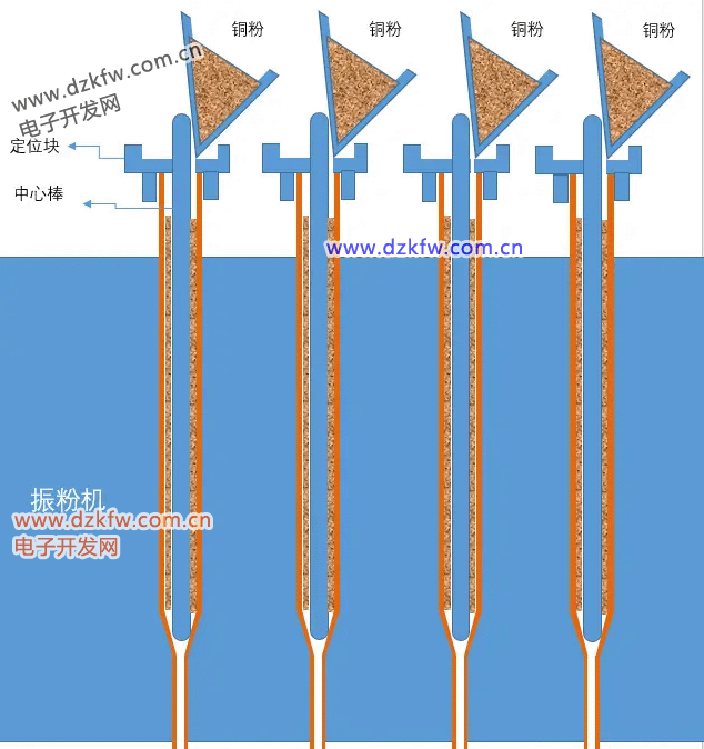 4>填粉-在铜管的中心插入一根不锈钢芯棒,并通过模具定位在铜管的正中间,然后填入指定粒度的铜粉(通过振动设备使铜粉达到一定的密度,以以控制烧结后毛细结构的孔隙率)