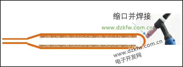 6>缩软管、焊接-缩尾端,也就是填铜粉的那一端,缩口并焊接使其密封