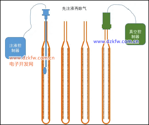 7>注液/一次除气:通过注液泵等定量注水控制设备往热管内部注入一定量的超纯水,并立即通过真空设备除去管体内部的空气,密封管口。