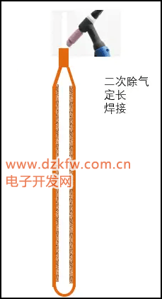 8>二次除气/定长:由于第一次真空除气可能不充分,这里再进行一次加热除气,第二次封口,并切出准确的长度尺寸,切完后用氩弧焊将切口焊接使其密封。