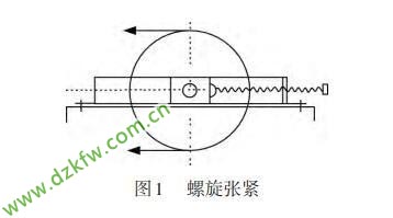 螺旋式张紧装置如图1所示,想要张紧或者放松皮带,只需要通过旋转螺杆,将活动架前进或后退,由于张紧装置固定在活动架上,因此会跟随着活动架向前或者后退。