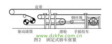 固定绞车式张紧装置如图2所示。电动绞车牵引滚筒车架,实现普通的拉力计控制,它的缺点也十分明显,只适用于小角度和近水平倾角的输送机场合。