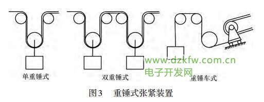 张紧装置在结构类型上有固定式、重锤式和自动式三类。