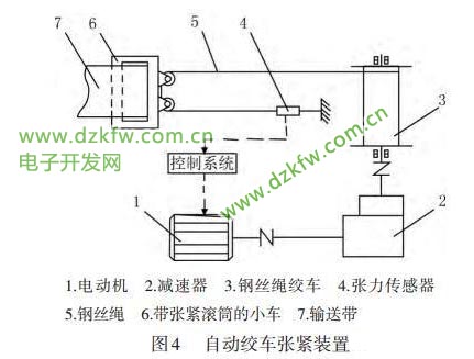 自动绞车张紧装置在使皮带具有合理的张紧力,适应皮带自身的形变方面有独特的优势,因此自动绞车式张紧装置在目前是应用最为广泛的。如图4所示: