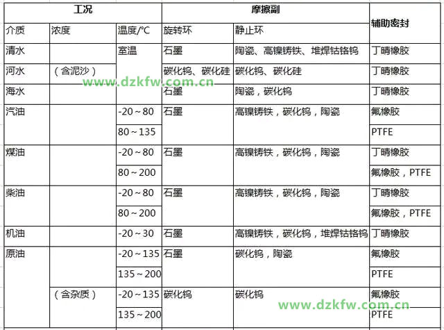 机械密封各主要零件的材料应根据使用工况进行选择,见下表。